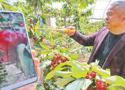 4月9日,秦皇島市海港區(qū)海陽鎮(zhèn)鯉泮莊村的祺和大櫻桃種植基地內(nèi),村民蘇士明使用網(wǎng)絡平臺直播推銷大櫻桃。 人民視覺