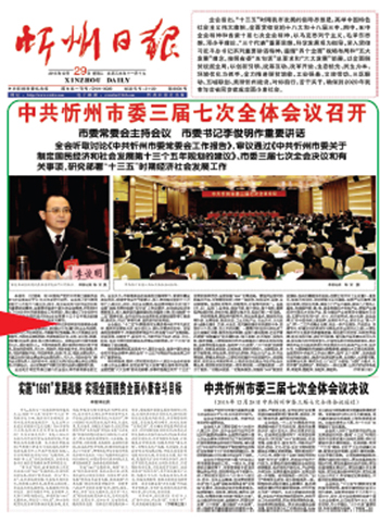 中國共產(chǎn)黨忻州市第三屆委員會第七次全體會議于12月28日在忻州召開。全會聽取討論了《中共忻州市委常委會工作報(bào)告》,審議通過了《中共忻州市委關(guān)于制定國民經(jīng)濟(jì)和社會發(fā)展第十三個五年規(guī)劃的建議》,研究部署了“十三五”時期經(jīng)濟(jì)社會發(fā)展工作。