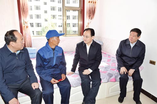 圖為市委書(shū)記李俊明在岢嵐縣城扶貧移民集中安置點(diǎn)回訪(fǎng)貧困戶(hù)曹六仁。馮曉磊 攝