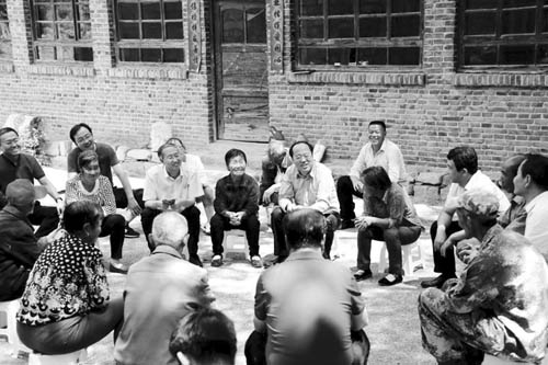 圖為市委常委、岢嵐縣委書記王志東,縣委副書記、縣長(zhǎng)侯俊生在岢嵐縣趙家洼村與搬遷群眾座談,共話發(fā)展。