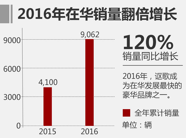 由于此前在華的產(chǎn)品投入等多方問(wèn)題,入華已經(jīng)達(dá)到10年的本田高端品牌謳歌,銷(xiāo)量并沒(méi)有得到顯著提升,2015年謳歌在中國(guó)市場(chǎng)的新車(chē)上牌量?jī)H為4,100輛,數(shù)據(jù)并不美麗。2016年謳歌重整旗鼓,制定完善的在華戰(zhàn)略,推出首款國(guó)產(chǎn)車(chē)型CDX后其銷(xiāo)量得到明顯提升,2016年累計(jì)售出9,062輛,同比大增120%,成為增速第二快的豪華品牌。
