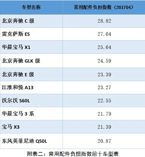 常用配件負擔指數(shù)方面,在汽車零整比系數(shù)基礎上,挖掘事故車維修數(shù)據(jù),選取配件損失率大于 1%的常用配件進行研究,導入計算公式核算各車型的常用配件負擔指數(shù)。在樣本車型中最高的車型為北京奔馳 C級,常用配件負擔指數(shù)為 28.82;最低的車型為哈弗 H6,常用配件負擔指數(shù)為 9.32。
