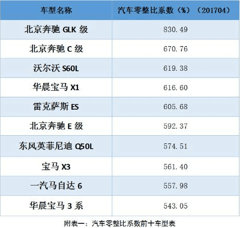 對于老百姓而言,在得知北京奔馳 GLK級配件的價格總和可以買 8輛整車時,可能也僅僅是增添了對這部分車主的“羨慕”,然而,奔馳寶馬在我國說到底本就不是平民車。那么,我們就來看看 2017年一季度賣得最好的幾個品牌車型的零整比系數(shù)如何,下面的數(shù)據(jù)對你買車真的有幫助呦!