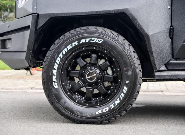 車身表面使用了亞光色涂裝,披上厚重的鋼板并經(jīng)過高溫噴砂處理,車窗采用了高強(qiáng)度復(fù)合玻璃,厚度比起一臺(tái)iPhone7還要厚。幾乎全車做過了防彈處理和碳纖維處理,側(cè)面還取消了C柱和D柱,換裝了具有一定防爆能力的輪胎,據(jù)說輪胎支持在全部破損的情況下勻速行駛。