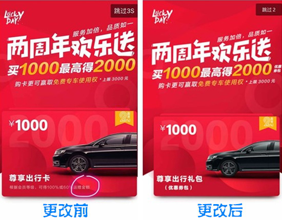 首汽約車App宣傳海報(bào)前后對比:“返贈(zèng)金額”變成了贈(zèng)送“優(yōu)惠券包”