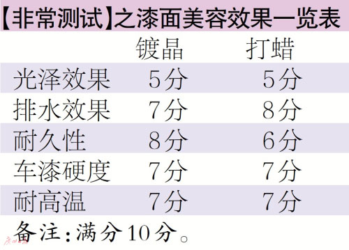 車天下君在兩塊車身試驗面板上進行測試,一塊鍍晶,一塊打蠟。全部按照說明書手工操作。車天下君是個理工男,做這些事情還算是輕車熟路。完工對比光澤效果,在都沒有拋光處理的情況下,鍍晶和打蠟都沒有起到提升漆面光澤的效果,給予“不及格”的差評。潑上水,漆面都形成水珠,但仔細比較,會發(fā)現(xiàn)打蠟的排水效果比鍍晶要好。