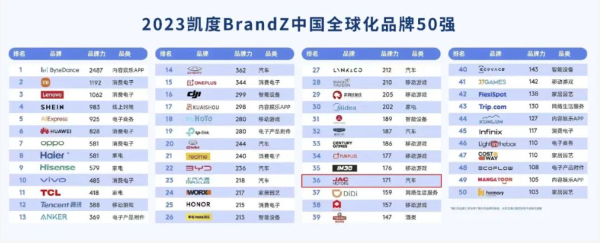 6月中旬,全球知名品牌排行榜凱度BrandZ攜手谷歌發(fā)布了《2023凱度BrandZ中國(guó)全球化品牌50強(qiáng)》榜單,江淮汽車位列中國(guó)全球化品牌第36位,相較2022年上升了4個(gè)名次,這是江淮汽車連續(xù)三年榮登該榜單,展現(xiàn)了持續(xù)、強(qiáng)勁的品牌增長(zhǎng)勢(shì)頭。