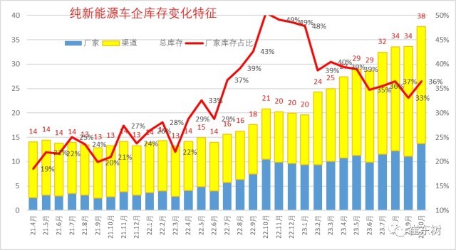 從僅生產(chǎn)新能源車的企業(yè)的庫(kù)存變化特征分析看,2023年年初庫(kù)存20萬(wàn),年初的庫(kù)存保持較好,總體新能源庫(kù)存在2月后開始持續(xù)地上升,目前上升到10月末的38萬(wàn)臺(tái)水平。近期主要增長(zhǎng)的是經(jīng)銷商庫(kù)存,這也是經(jīng)銷模式為主流進(jìn)行新能源銷售的結(jié)果。