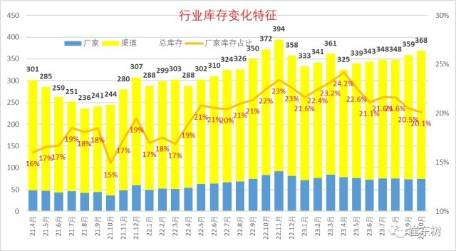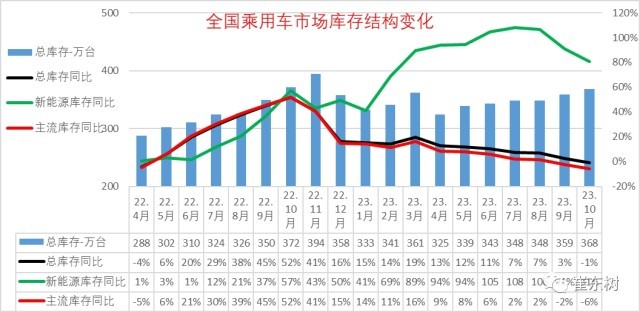 根據(jù)乘聯(lián)會(huì)的數(shù)據(jù),2023年10月月末全國(guó)乘用車庫(kù)存368萬(wàn)臺(tái),其中廠家?guī)齑?4萬(wàn)臺(tái),渠道庫(kù)存294萬(wàn)臺(tái),廠家?guī)齑嬲急?0.1%,較2022年10月下降1.9個(gè)百分點(diǎn),環(huán)比上月下降0.4個(gè)百分點(diǎn)。