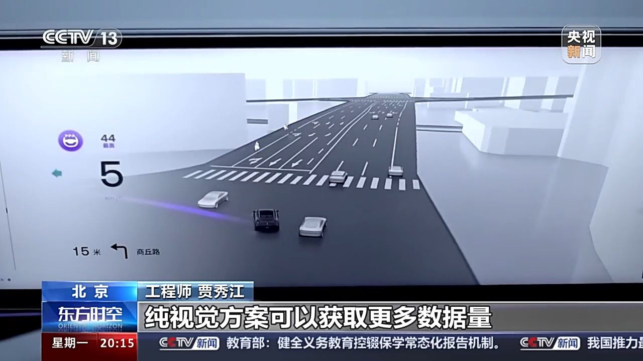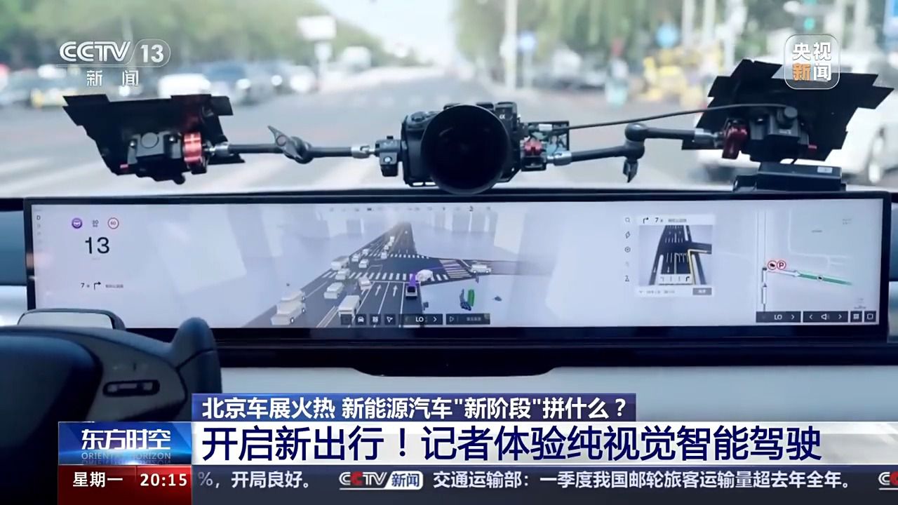 國家智能網聯(lián)汽車創(chuàng)新中心常務副主任 鄭繼虎:汽車產業(yè)上半場是新能源汽車,下半場是智能網聯(lián)汽車,這是全球的一個共識。我們基于車、路、云一體化在做多模態(tài)的整個場景數據庫的構建。 開啟新出行!記者體驗純視覺智能駕駛 如今智能汽車已成為全球汽車產業(yè)發(fā)展的戰(zhàn)略方向。據《全球智能網聯(lián)汽車預測報告(2020—2024)》預測,到今年,全球出貨的新車中超過71%將搭載智能網聯(lián)系統(tǒng),市場正在日趨成熟。智能化出行是什么樣子?在車展舉辦期間,記者就體驗了一次純視覺智能駕駛,給未來出行帶來全新感受。 這臺汽車采用了純視覺智能駕駛方案,不依賴高精地圖,通過高清攝像頭和強大算力,就能更準確地識別周圍環(huán)境,通過大模型技術,能夠帶來全新的智駕體驗。