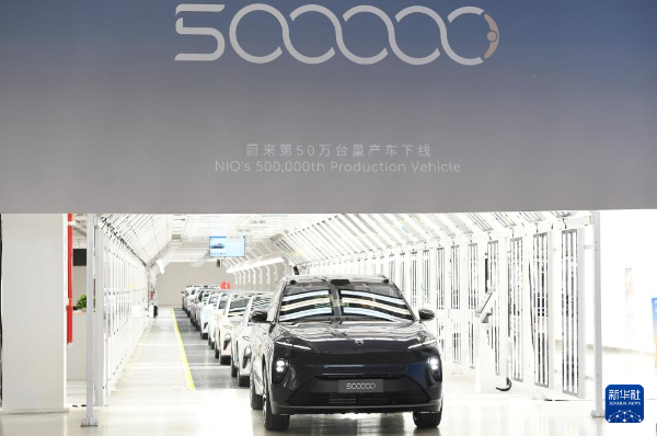 5月9日,在安徽省合肥市新橋智能電動(dòng)汽車(chē)產(chǎn)業(yè)園蔚來(lái)第二工廠,蔚來(lái)第50萬(wàn)臺(tái)量產(chǎn)車(chē)下線。新華社記者張端攝