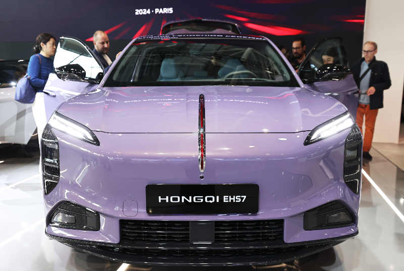 10月14日,人們?cè)诜▏?guó)巴黎凡爾賽門(mén)展覽中心舉行的2024巴黎車(chē)展媒體開(kāi)放日上參觀紅旗展臺(tái)。新華社記者 高靜 攝