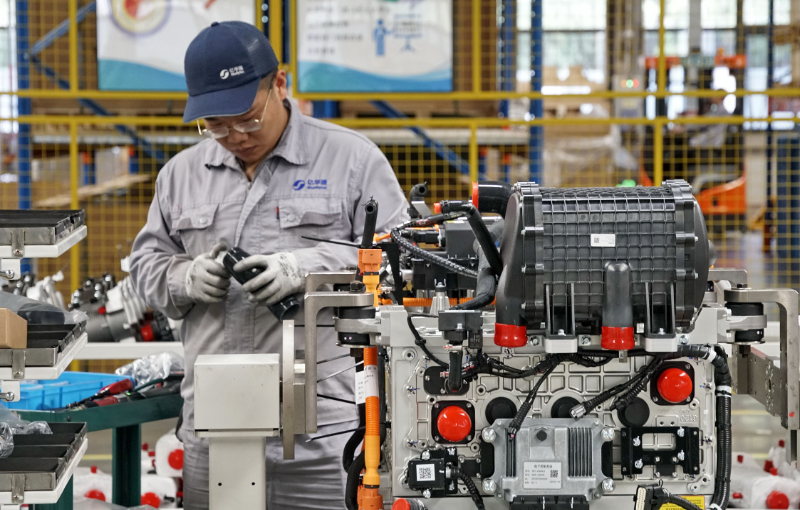 圖為在北京大興國際氫能示范區(qū)內(nèi),一家生產(chǎn)氫能燃料電池發(fā)動機企業(yè)的員工在裝配設(shè)備。新華社記者 李欣 攝