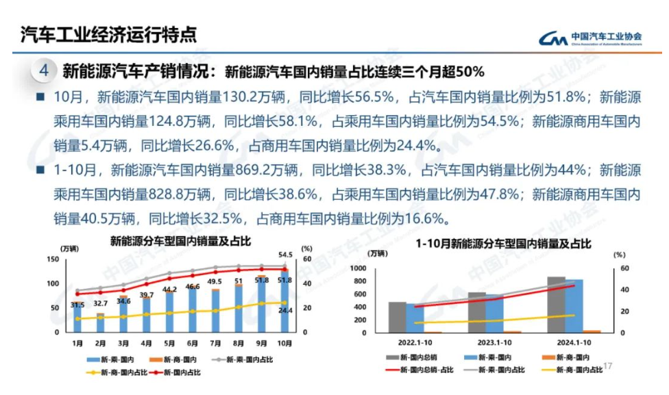 在新能源汽車方面,10 月,新能源汽車產(chǎn)銷分別完成 146.3 萬輛和 143 萬輛,同比分別增長 48% 和 49.6%,新能源汽車新車銷量占汽車新車總銷量的 46.8%。1-10 月,新能源汽車產(chǎn)銷分別完成 977.9 萬輛和 975 萬輛,同比分別增長 33% 和 33.9%,新能源汽車新車銷量達(dá)到汽車新車總銷量的 39.6%。