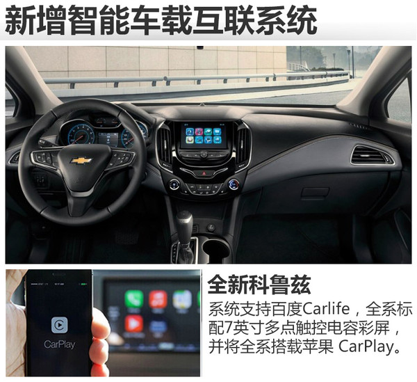 在配置方面,新車搭載了新一代MyLink智能車載互聯(lián)系統(tǒng),支持百度Carlife,全系標(biāo)配7英寸多點(diǎn)觸控電容彩屏,并將全系搭載蘋(píng)果 CarPlay。全新科魯茲還將新一代安吉星Onstar智能行車伙伴和4G LTE原裝集成車載Wi-Fi,可同時(shí)接入多個(gè)設(shè)備。