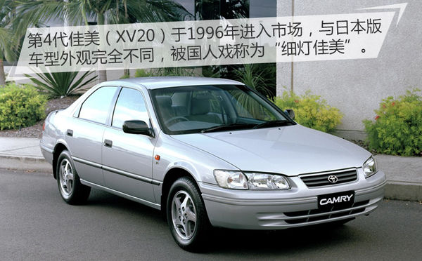 第4代佳美(XV20)于1996年進(jìn)入市場(chǎng),進(jìn)入國內(nèi)的仍是佳美海外版車型,在設(shè)計(jì)上與日本本土版采用了完全不同的理念。讓整車看上去更加修長流暢,車頭和車尾都被設(shè)計(jì)得趨于扁平,由此帶來的是更細(xì)長的頭燈和尾燈,所以XV20在國內(nèi)被人們戲稱為“細(xì)燈佳美”。
