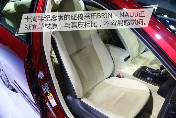 十周年紀(jì)念版凱美瑞將原本就已經(jīng)是真皮包裹的座椅更換了“新裝”,采用了最新研發(fā)的BRIN?NAUB材質(zhì)的正絨面革。與真皮材質(zhì)相比,這種全新的材料不容易有悶的感覺,夏天的時(shí)候不會(huì)越坐越熱。冬天的時(shí)候,剛坐進(jìn)車?yán)镆膊粫?huì)感覺特別涼,這樣直接省去了再配坐墊的麻煩。BRIN?NAUB材質(zhì)還具有更好的彈性和延展性,長期坐壓之后不易變形。
