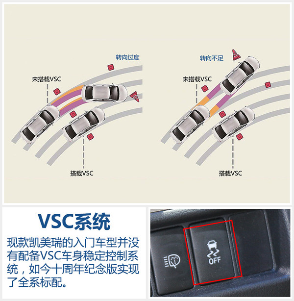目前在售的現(xiàn)款凱美瑞入門版車型,并沒有配備VSC車型穩(wěn)定控制系統(tǒng),這對(duì)于預(yù)算有限的消費(fèi)者來說,原本可以成為購買目標(biāo)的凱美瑞,很有可能就因?yàn)檫@一個(gè)配置被篩掉了。如今,十周年紀(jì)念版實(shí)現(xiàn)了全系車型標(biāo)配VSC系統(tǒng)。