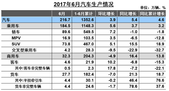 6月,我國(guó)汽車產(chǎn)銷分別為216.7萬輛和217.2萬輛,環(huán)比分別增長(zhǎng)3.9%和3.6%,同比分別增長(zhǎng)5.4%和4.5%。上半年,我國(guó)汽車產(chǎn)銷分別為1352.6萬輛和1335.4萬輛,比上年同期分別增長(zhǎng)4.6%和3.8%,低于上年同期1.9和4.3個(gè)百分點(diǎn)。
