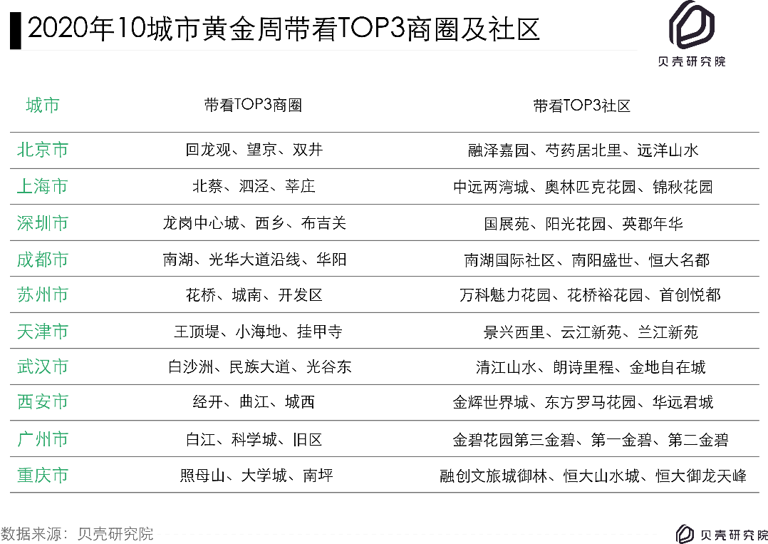 同樣,每個城市都有熱門商圈與人氣社區(qū)。此次,貝殼研究院特別梳理出2020年黃金周期間帶看量最高的十個城市,并找到其熱門商圈和社區(qū)。以城市帶看龍頭北京為例,回龍觀、望京、雙井商圈帶看熱度高,排名城市商圈TOP3;而融澤嘉園、芍藥居北里、遠洋山水三個社區(qū)帶看熱度在社區(qū)榜中關注度最高。