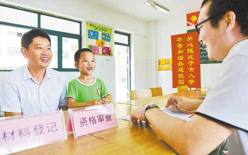 在安徽合肥市和平小學(xué)花沖分校報(bào)名點(diǎn),畢權(quán)航和父親畢金倉(cāng)(左)在辦理報(bào)名入學(xué)相關(guān)手續(xù)(2017年7月12日攝)。合肥市瑤海區(qū)進(jìn)城務(wù)工人員隨遷子女入學(xué)報(bào)名工作啟動(dòng)后,該區(qū)教育部門(mén)在各定點(diǎn)學(xué)校設(shè)置“隨遷子女入學(xué)幫你辦”窗口,安排工作人員協(xié)助辦理,同時(shí)設(shè)置家長(zhǎng)意見(jiàn)箱,監(jiān)督入學(xué)辦理的全過(guò)程。 新華社記者 張 端攝