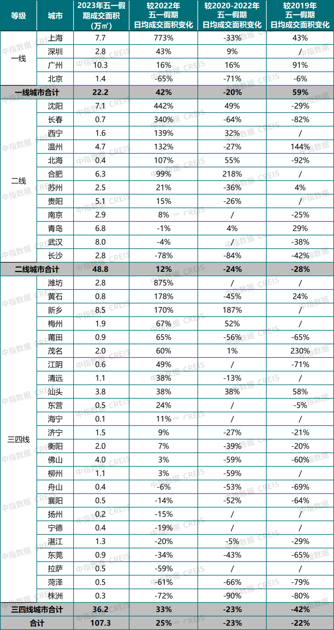 根據(jù)中指研究院數(shù)據(jù),2023年“五一”期間,代表城市成交規(guī)模較去年五一假期增長約25%,其中多個城市受低基數(shù)影響,同比增幅較大,但整體較2019年同期降幅仍超兩成。