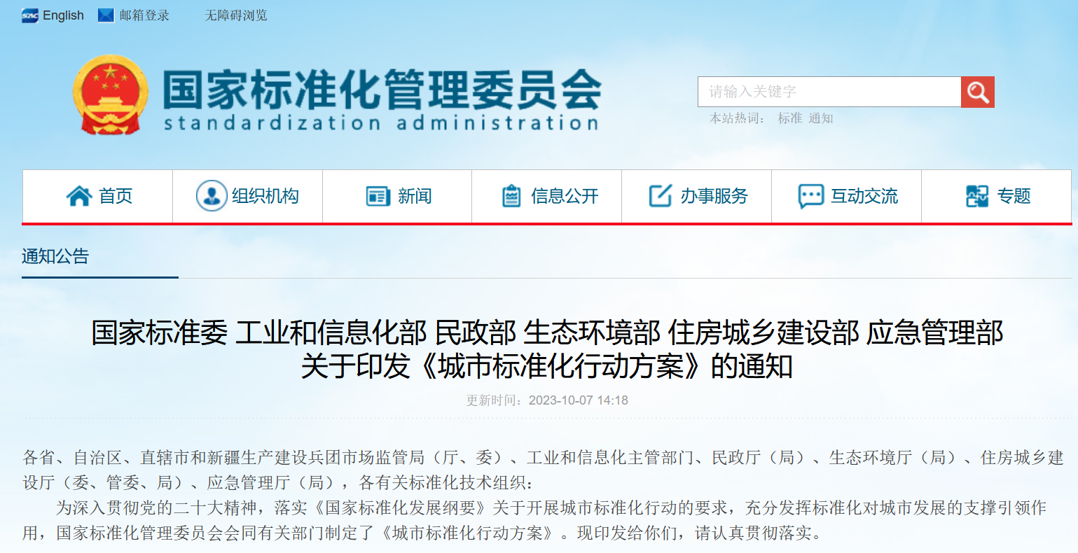 央廣網(wǎng)北京10月8日消息 據(jù)國(guó)家標(biāo)準(zhǔn)化管理委員會(huì)網(wǎng)站消息,為落實(shí)《國(guó)家標(biāo)準(zhǔn)化發(fā)展綱要》關(guān)于開展城市標(biāo)準(zhǔn)化行動(dòng)的要求,充分發(fā)揮標(biāo)準(zhǔn)化對(duì)城市發(fā)展的支撐引領(lǐng)作用,近日,國(guó)家標(biāo)準(zhǔn)化管理委員會(huì)會(huì)同工業(yè)和信息化部、民政部、生態(tài)環(huán)境部、住房城鄉(xiāng)建設(shè)部、應(yīng)急管理部制定了《城市標(biāo)準(zhǔn)化行動(dòng)方案》(以下簡(jiǎn)稱《行動(dòng)方案》)。