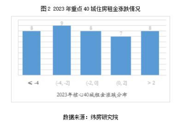 從漲跌結(jié)構(gòu)看,緯房研究院數(shù)據(jù)顯示,2023年重點(diǎn)40城中有15個(gè)城市住房租金同比上漲,其余25個(gè)城市住房租金同比下降。住房租金上漲的城市中,7個(gè)城市漲幅在2%以內(nèi),8個(gè)城市漲幅超過2%;住房租金下跌的城市中,8個(gè)城市跌幅在2%以內(nèi),9個(gè)城市跌幅在2-4%;8個(gè)城市跌幅超過4%。