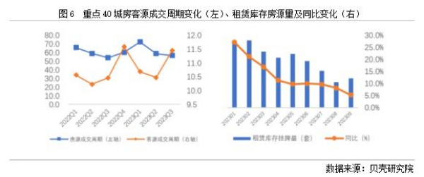 依據(jù)貝殼研究院數(shù)據(jù)監(jiān)測(cè),全國重點(diǎn)40城2023年三季度房客源成交周期分別為56.7、11.5天,房源成交周期環(huán)比減少2.1天,同比增加2.7天;客源成交周期環(huán)比延長1天,同比延長1天。隨著個(gè)人租賃房源供應(yīng)的增加,疊加保障性租賃住房、市場(chǎng)化集中式租賃房源的增加,個(gè)人業(yè)主出租房源出租速度減緩。從庫存房源來看,2023年1-9月租賃庫存房源量均呈現(xiàn)同比增加的趨勢(shì),與此同時(shí),租客租房面臨的選擇項(xiàng)增多,租客對(duì)于租賃房源可選類型和房源量均有增加。