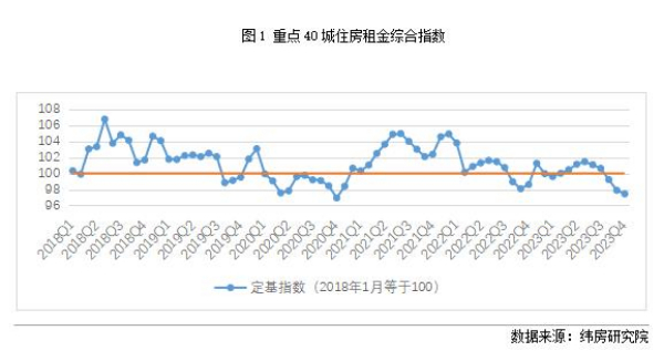 分時(shí)間段來看,住房租金總體呈現(xiàn)先升后降的趨勢(shì)。受到校畢業(yè)生租房需求增加的影響,住房租金水平波動(dòng)上漲,從2022年末的98.61漲至2023年7月的101.45。隨著需求的釋放,住房租金隨后進(jìn)入下降趨勢(shì),核心40城租金指數(shù)降至2023年末的97.44。2023年末的租金水平與2022年末相比,下降了1.19%。租金水平雖有所下降,但總體穩(wěn)定,未出現(xiàn)大起大落。