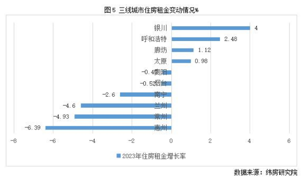 三線城市住房租金漲跌接近參半。住房大數(shù)據(jù)監(jiān)測(cè)的重點(diǎn)40城中包括10個(gè)三線城市,其中4個(gè)城市2023年住房租金小幅上漲,6個(gè)城市下降。其中,銀川和呼和浩特漲幅最高,分別為4%和2.48%;惠州、常州和蘭州住房租金跌幅較高,分別為6.39%、4.93%和4.6%。
