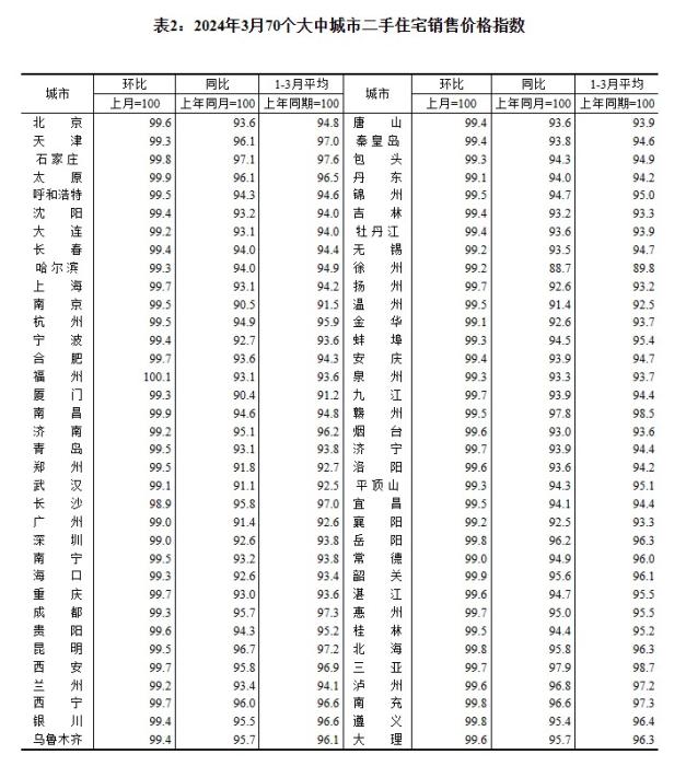 2024年3月70個(gè)大中城市二手住宅銷售價(jià)格指數(shù)。 截圖自國(guó)家統(tǒng)計(jì)局官網(wǎng)