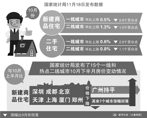 國家統(tǒng)計局城市司高級統(tǒng)計師劉建偉介紹,與10月份上半月比,10月份下半月新建商品住宅價格除深圳和成都2個城市繼續(xù)下降外,北京、天津、上海、廈門和鄭州等5個城市也由升轉(zhuǎn)降,降幅在0.1至0.4個百分點之間;其余7個城市新建商品住宅價格環(huán)比漲幅進一步回落,回落幅度在0.4至3.3個百分點之間。