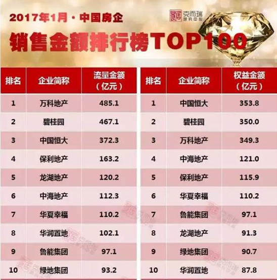 2017年1月中國房前銷售金額排行榜前十(來源:克而瑞研究中心)