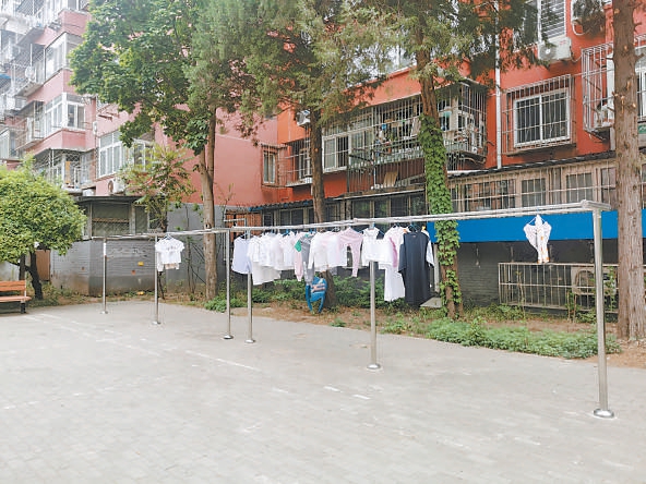 走出古城南路社區(qū)東門,沿古城東街北行400余米右轉(zhuǎn)進(jìn)入八角北路社區(qū),只見幾株高大的國(guó)槐及道邊的綠藤錯(cuò)落有致。再向里走,是一塊寬闊的活動(dòng)場(chǎng)地,北側(cè)建有一排不銹鋼晾衣架,架上晾滿了衣服?!坝芯用裉岢黾依镪柵_(tái)上晾衣服不方便,我們特地尋找合適地方,為這些社區(qū)建了晾衣架。”北京石房物業(yè)有限公司(以下簡(jiǎn)稱石房物業(yè))副經(jīng)理孫偉說。