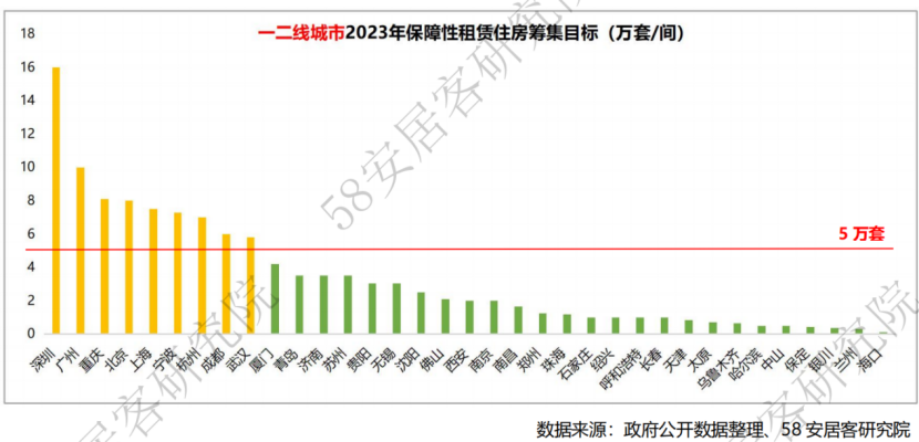 從“十四五”時期城市保障性租賃住房規(guī)劃目標(biāo)來看,人口規(guī)模較大的一二線城市是保障性租賃住房的供應(yīng)主力區(qū)域。58同城、安居客整理數(shù)據(jù)顯示,其中,一線城市在整體規(guī)劃規(guī)模中占比約26.5%,二線城市占比約57.4%。同時,二線城市之間的差異較大,強二線省會城市規(guī)劃規(guī)模在15萬套以上。今年,一二線城市保障性租賃住房籌集量占已公布城市籌集目標(biāo)總量的75.2%,核心9城2023年保障性租賃住房籌集目標(biāo)超過5萬套(間)。深圳、廣州今年的籌集目標(biāo)較高,達(dá)到10萬套(間)以上。