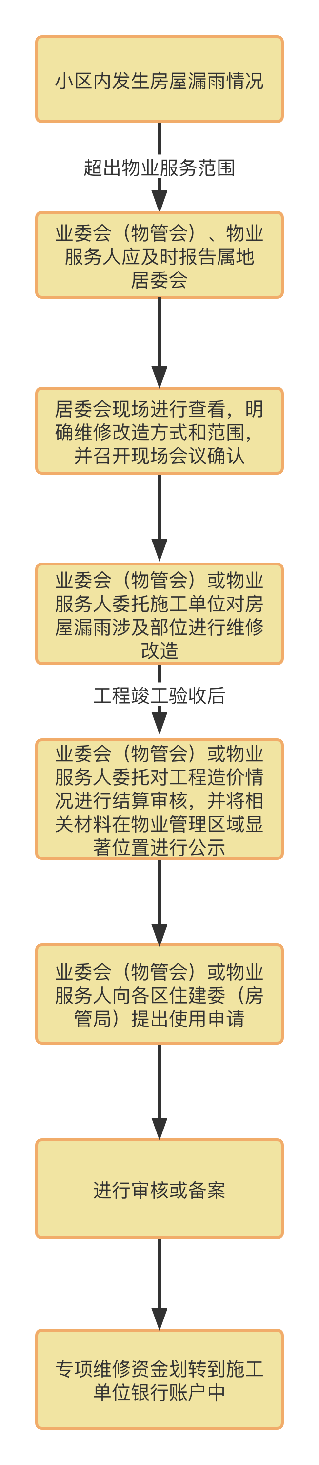 當(dāng)住宅小區(qū)內(nèi)發(fā)生房屋漏雨情況,并且已經(jīng)超出物業(yè)服務(wù)合同約定的物業(yè)服務(wù)人維修范圍時(shí),小區(qū)業(yè)委會(huì)(物管會(huì))、物業(yè)服務(wù)人應(yīng)及時(shí)將情況向?qū)俚鼐樱ù澹┟裎瘑T會(huì)報(bào)告。