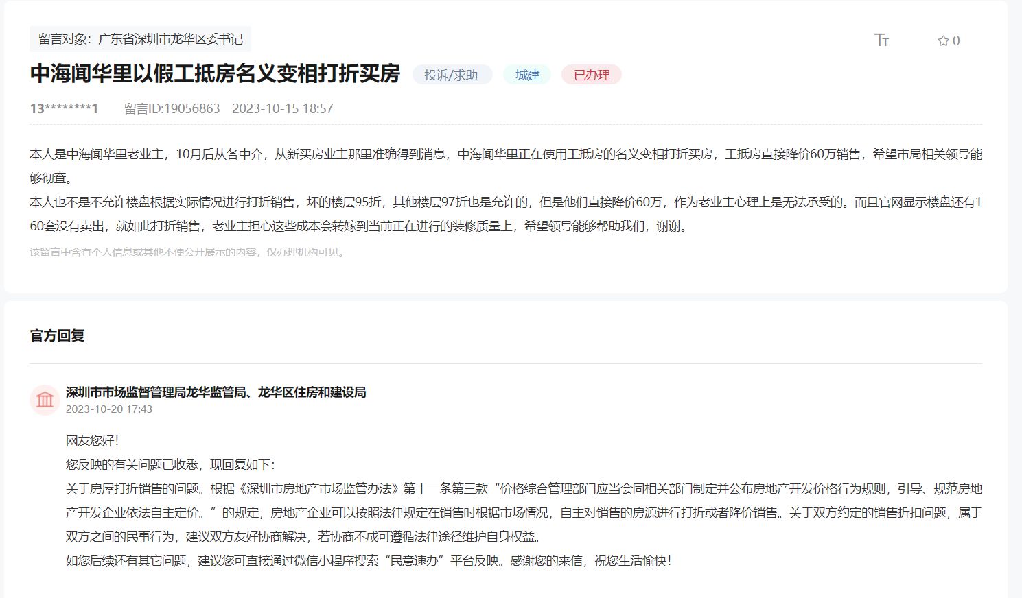 稍早的10月15日,一名自稱深圳市龍華區(qū)中海聞華里老業(yè)主在領(lǐng)導(dǎo)留言板留言稱,該樓盤以假工抵房名義變相打折買房。