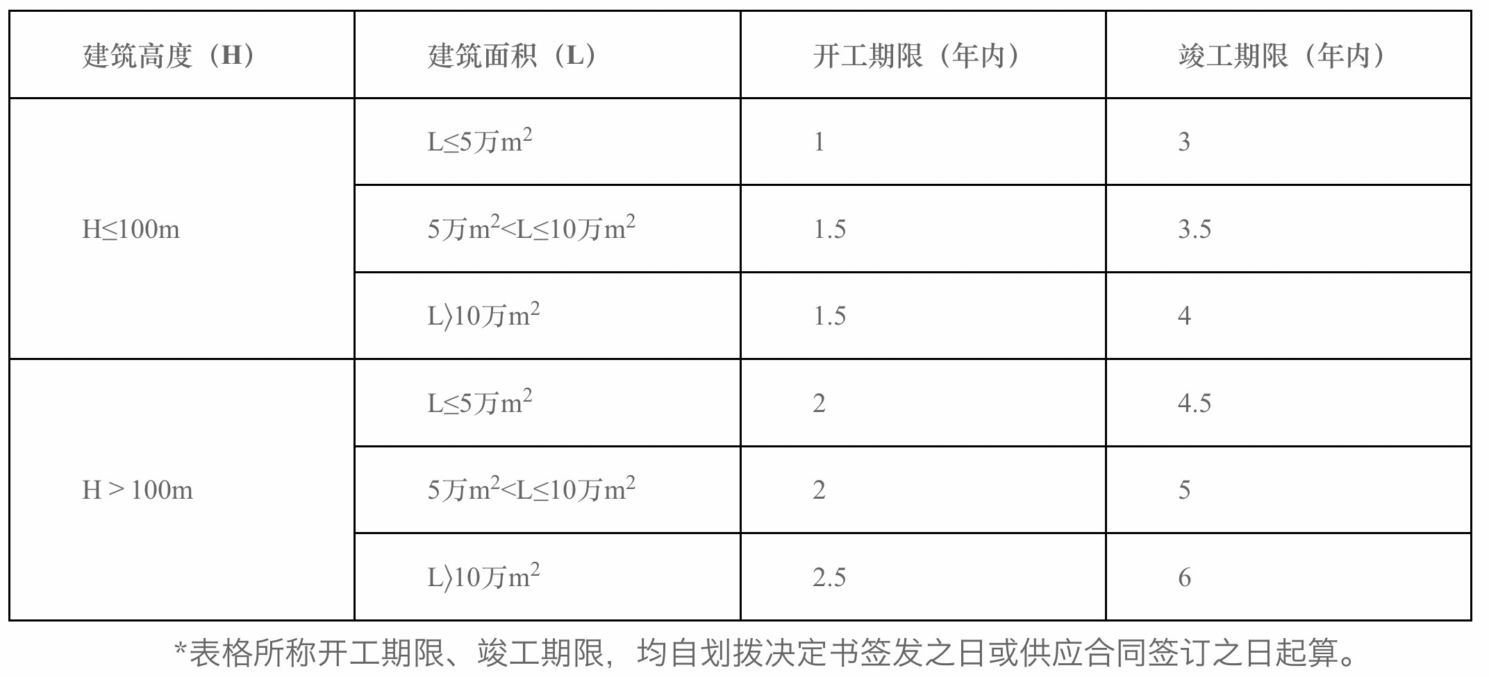 《辦法》根據(jù)項(xiàng)目用地性質(zhì)、建筑高度和建筑規(guī)模的不同,對(duì)建設(shè)用地的開工、竣工期限作出規(guī)定。(一)主體功能為住房類建設(shè)項(xiàng)目應(yīng)在劃撥決定書簽發(fā)之日或供應(yīng)合同簽訂之日起1年內(nèi)開工建設(shè),自劃撥決定書簽發(fā)之日或供應(yīng)合同簽訂之日起4年內(nèi)竣工。(二)主體功能為非住房類建設(shè)項(xiàng)目的開工、竣工期限按下表規(guī)則確定。其中,建設(shè)項(xiàng)目地下室≥3層的,其開工日期可再延長(zhǎng)6個(gè)月,竣工期限相應(yīng)順延。
