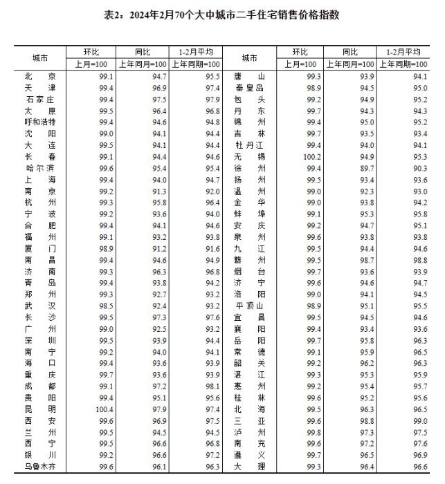 2024年2月70個(gè)大中城市二手住宅銷(xiāo)售價(jià)格指數(shù)。 截圖自國(guó)家統(tǒng)計(jì)局官網(wǎng)