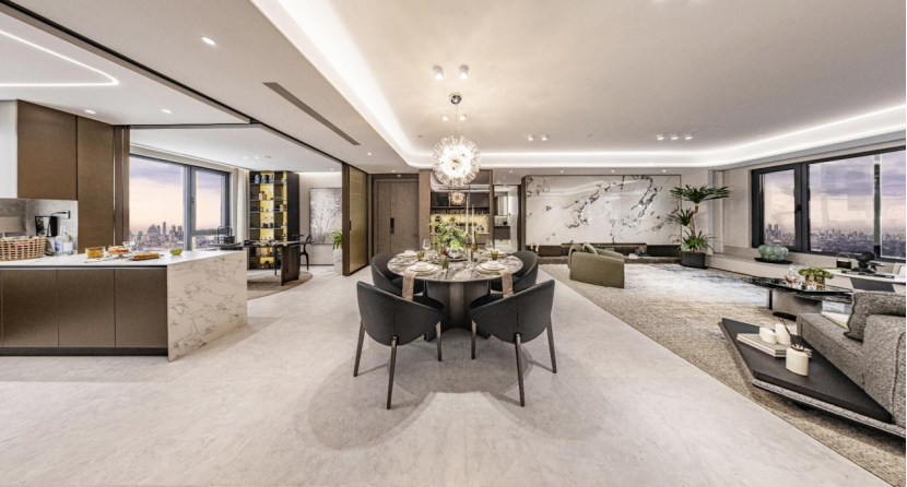 北熙區(qū)170平方米的四室兩廳兩衛(wèi)戶型則采用了現(xiàn)代簡約的設計風格,摒棄繁復裝飾,使用精選皮革、藝術玻璃、古銅不銹鋼等現(xiàn)代材質(zhì)匹配大尺度橫向空間,塑造質(zhì)感美學空間。整體格局規(guī)整,南向面寬達13.85米,且設計了通透、多變的客廳空間,既能與廚房聯(lián)通,也可與書房互動,可以是朋友們的歡聚場,也可以是靜享品茗、閱讀美好時光的生活場。主臥套房酒店式設計,獨立衣帽間、獨立衛(wèi)浴,彰顯居者的居住尺度。