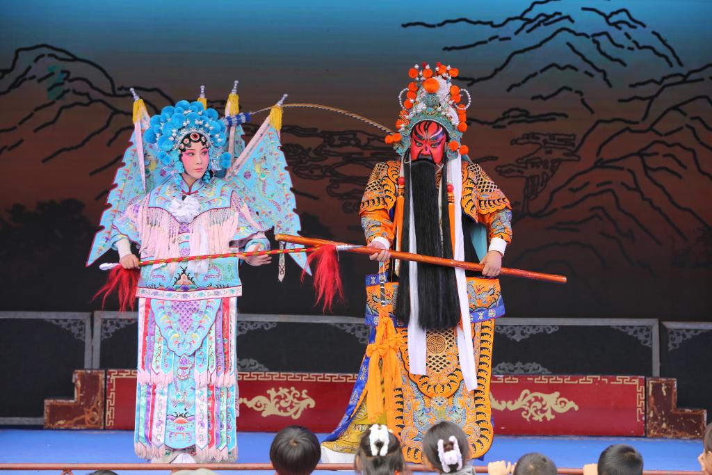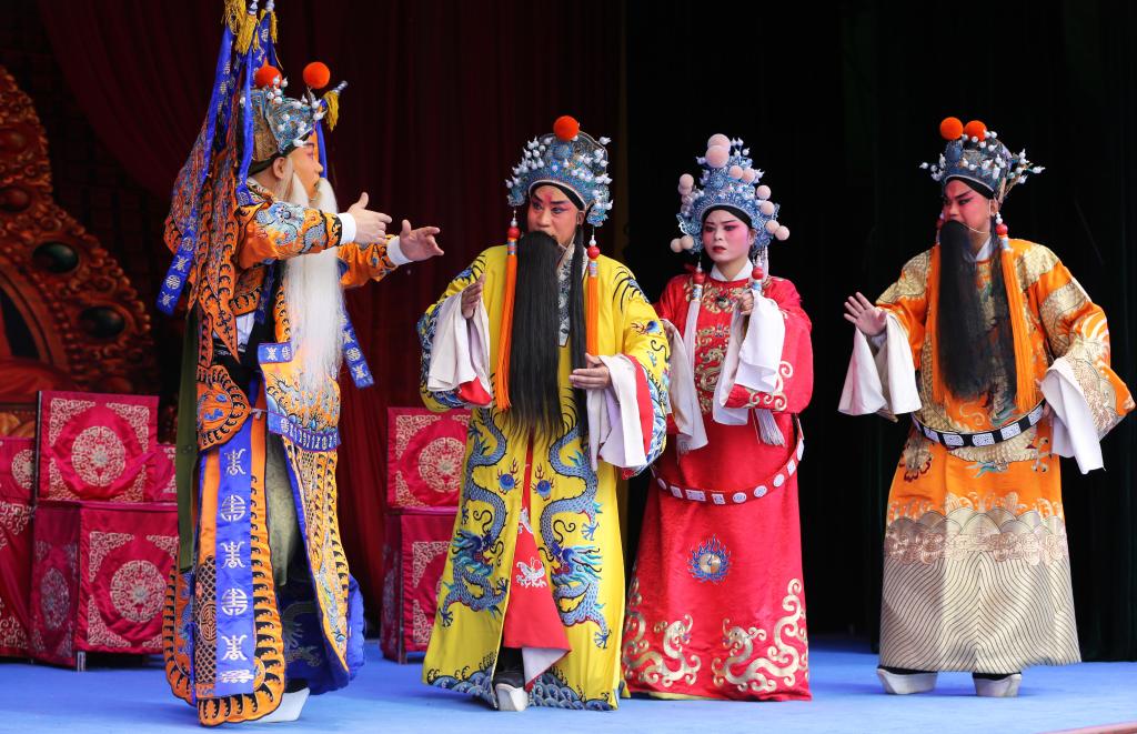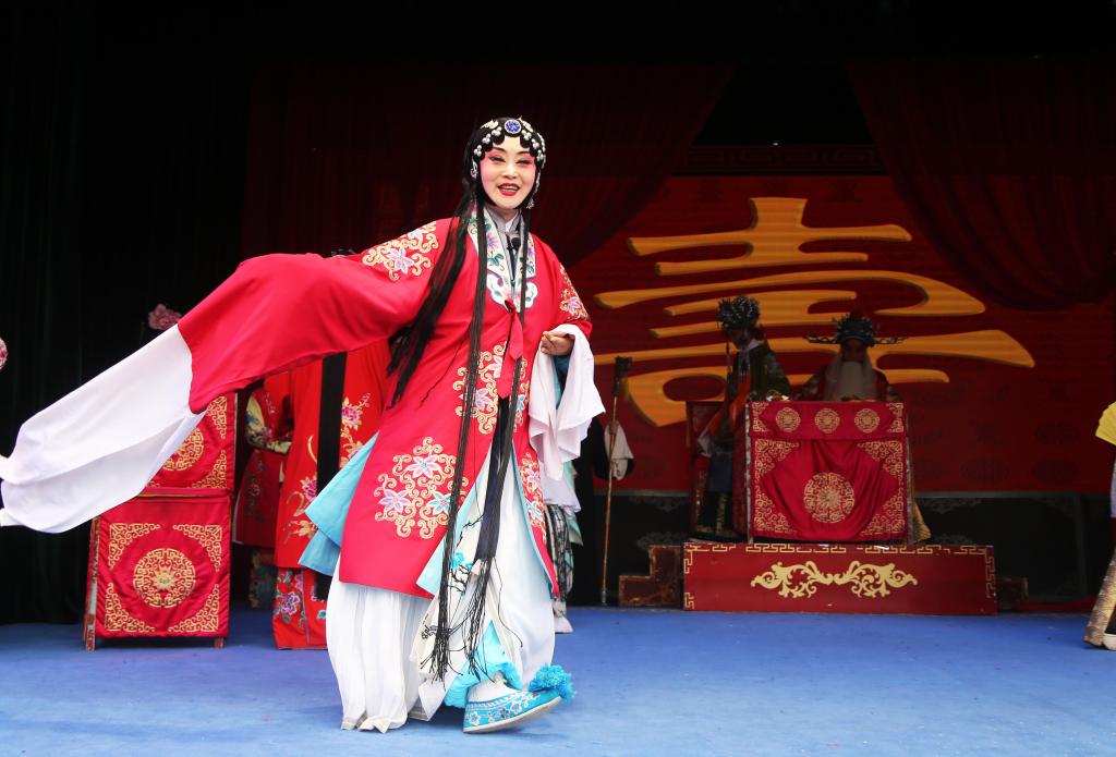 演員在甘肅省定西市體育公園演唱秦腔經(jīng)典傳統(tǒng)劇《打金枝》(9月19日攝)。新華社發(fā)(王克賢攝)
