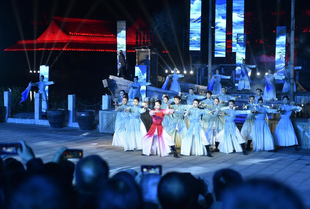 11月16日晚,演員在建業(yè)電影小鎮(zhèn)內(nèi)為觀眾表演。新華社記者 戴翹楚 攝