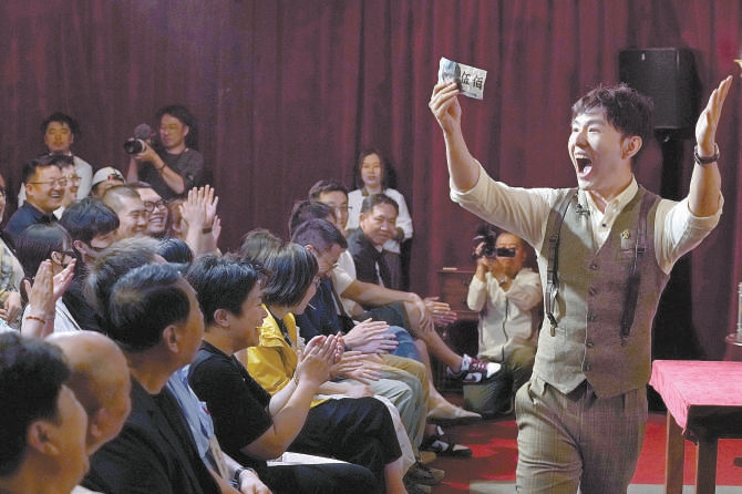 鄧男子(右)在觀(guān)眾面前展示近景魔術(shù)。記者 方非 攝