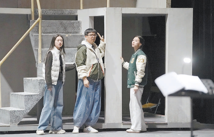 李佳軒(中)在給兩位演員說戲。北京日報(bào)記者 方非攝