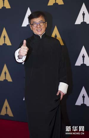 11月12日,成龍出席在洛杉磯好萊塢舉行的第8屆美國(guó)電影藝術(shù)與科學(xué)學(xué)院(簡(jiǎn)稱影藝學(xué)院)理事會(huì)獎(jiǎng)?lì)C獎(jiǎng)典禮。影藝學(xué)院理事會(huì)12日授予中國(guó)影星成龍和其他三位英美電影人奧斯卡終身成就獎(jiǎng),以表彰他們?yōu)殡娪八囆g(shù)作出的杰出貢獻(xiàn)。成龍也是首位獲此殊榮的華人。新華社記者楊磊攝