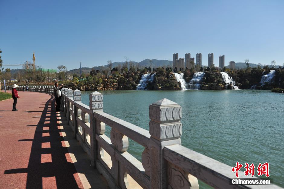 1月5日,游客在昆明瀑布公園內(nèi)游覽拍照。據(jù)了解,昆明瀑布公園1月1日開始對(duì)民眾開放,公園的瀑布利用牛欄江引水入滇工程而形成人工瀑布及湖泊,其利用約12.5米的地勢(shì)高差,建設(shè)成寬幅約400米的人工瀑布,是中國(guó)最大人工瀑布。 中新社記者 任東 攝