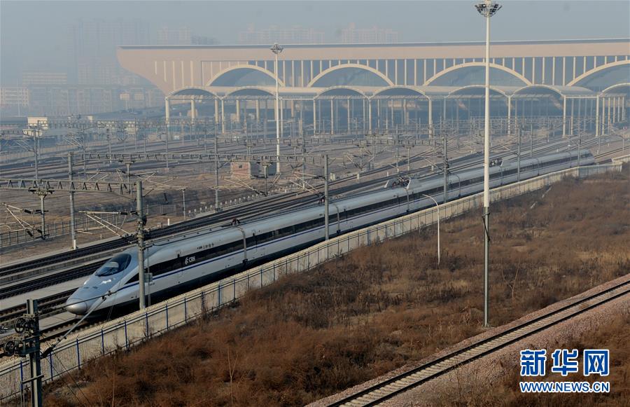 一輛動車組列車駛離石家莊火車站(1月9日攝)。 1月10日零時(shí)起,全國鐵路實(shí)行新的列車運(yùn)行圖,增開旅客列車285.5對,其中增開動車組列車281.5對。運(yùn)行圖調(diào)整后,全國鐵路開行旅客列車總數(shù)達(dá)到3142對,其中動車組列車1980.5對。新華社記者 牟宇 攝
