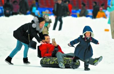 鳥(niǎo)巢主場(chǎng)北側(cè)的歡樂(lè)戲雪區(qū)是一片無(wú)拘無(wú)束的雪海:拉上雪圈繩就能孩子載著爸媽、爸媽載著孩子在雪圈廣場(chǎng)恣意撒歡兒。(記者左穎)