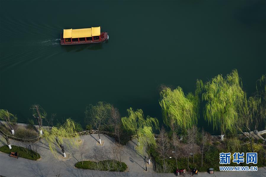 3月17日,山東濟南大明湖畔楊柳吐翠,杏花飄香,市民踏春游湖盡享明媚春光。 新華社記者 郭緒雷 攝
